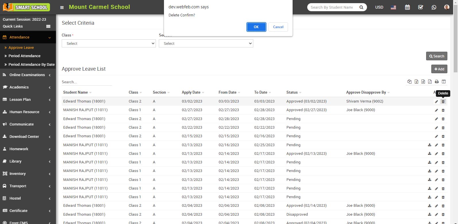 To mark student attendance, go to Attendance > Student Attendance then select Class, Section and Attendance Date and then click on Search button. The list of student will be shown in the below of the page.