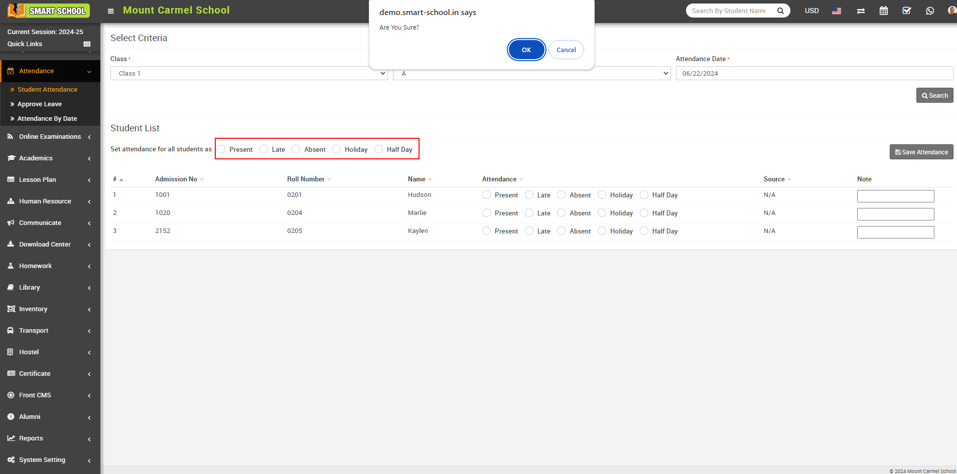 Now if you want to mark the same attendance, there is Set attendance for all Students as option available right above of the attendance, When you select Present, confirmation message will be open.