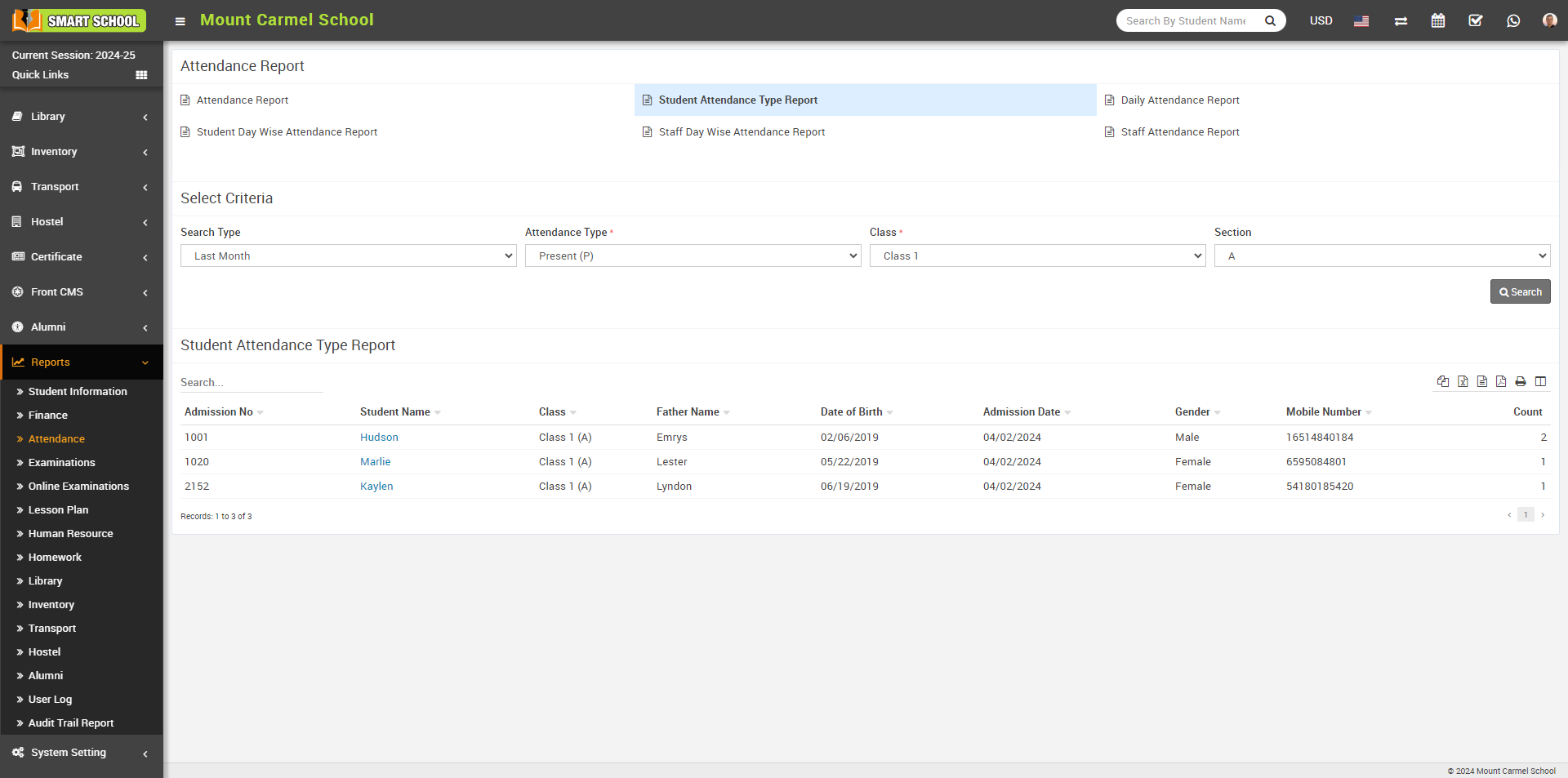 To check attendance report, go to Report > Attendance click on Attendance Report. Here select Class, Section, Month and Year and then click on Search button. The list of searched record will be shown in the below of the page.
