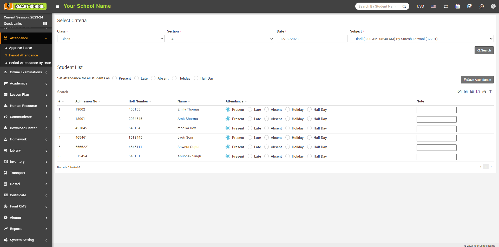 Here select Attendance (Present, Late, Absent, Holiday, Half day) for mark the attendance manually, and then click on the Save Attendance button.