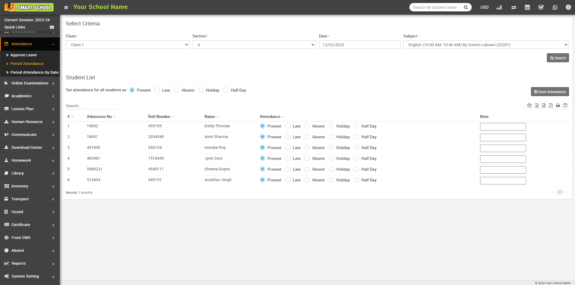 Now, click on the OK button. All the students below will be marked as Present. Afterward, click on the Save Attendance button to ensure that the attendance marks are recorded successfully and in the Source column shows the type of attendance.