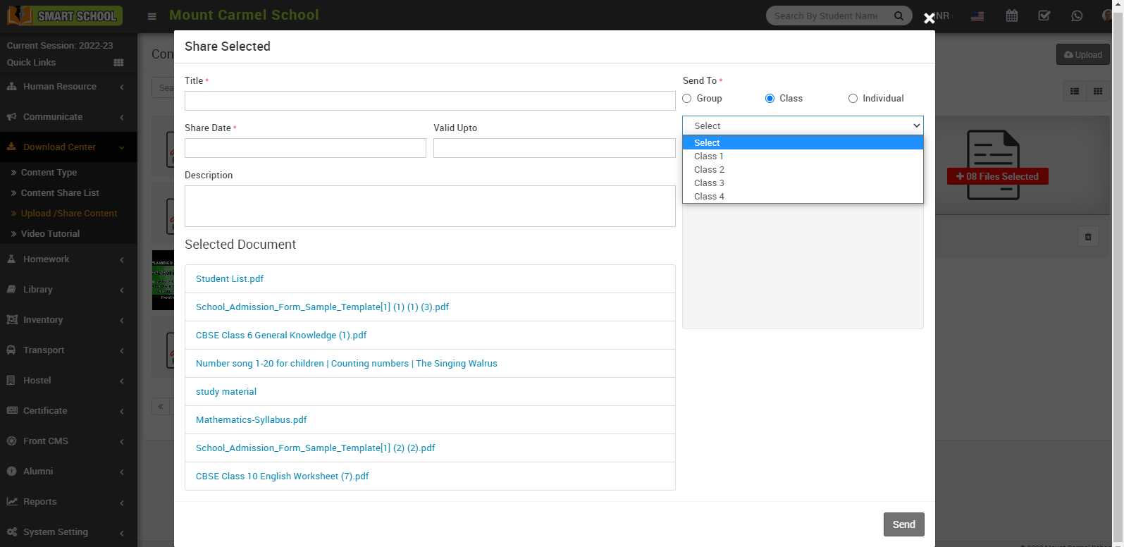 To view the content share list, go to Download Centre > Content Share List. Content share list will be open, in this list you can see the content details as Title, Send to, Share Date, Valid Upto, Shared By, and Description of content. In the action column, here link, view and delete option available.
