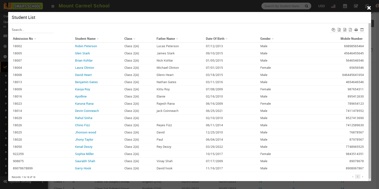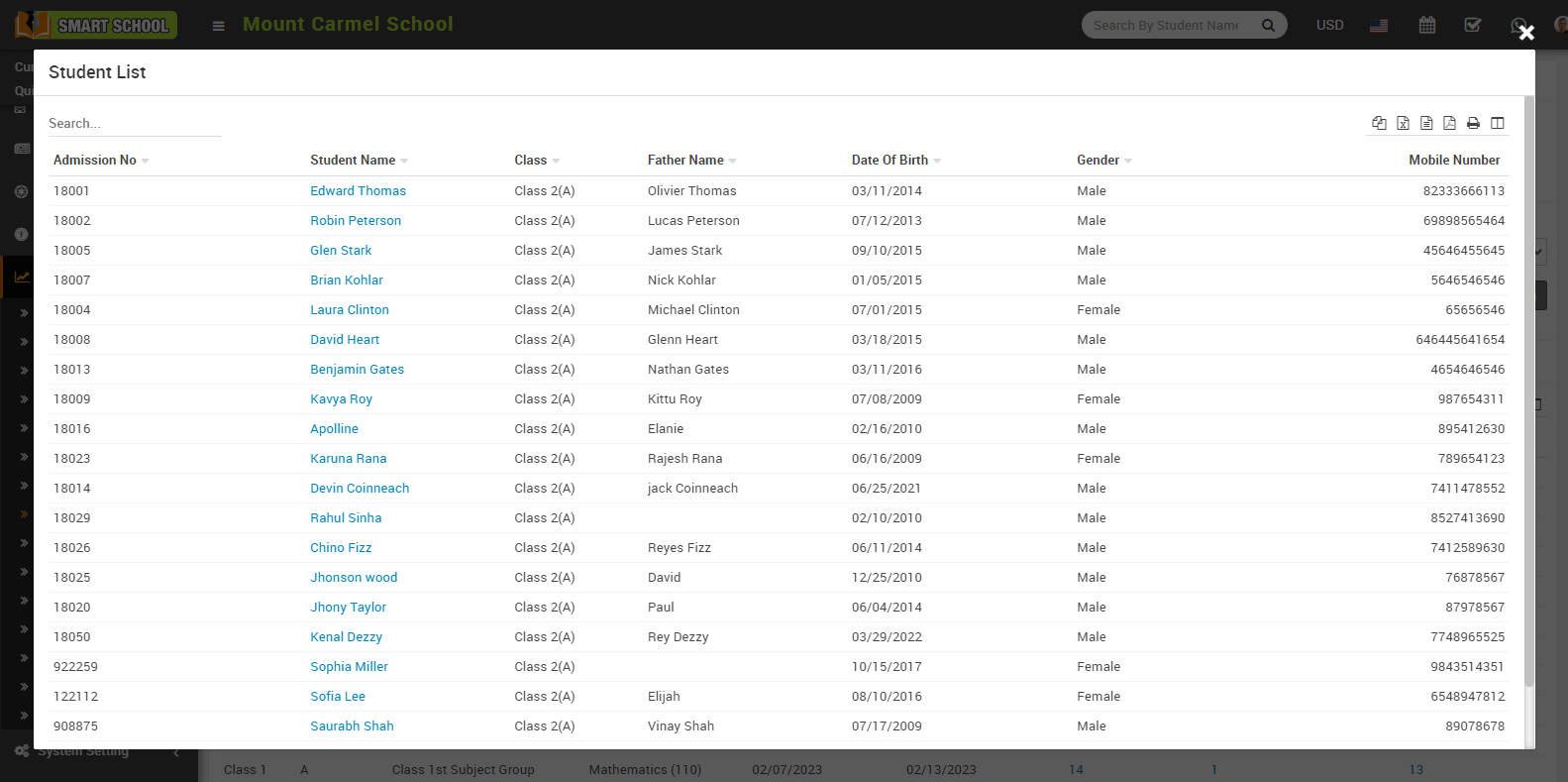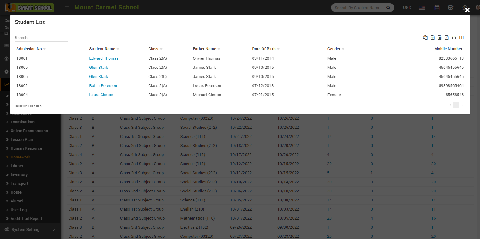 Student Count, in this column, shows the count of students who were assigned homework by the teacher. Simply click on the number in the student count column to open a student list with all of the students' information, including their admission number, student name, class, father's name, date of birth, gender, and mobile number.