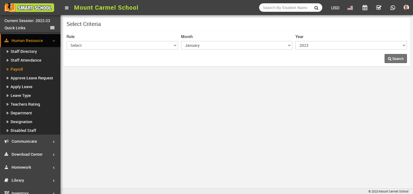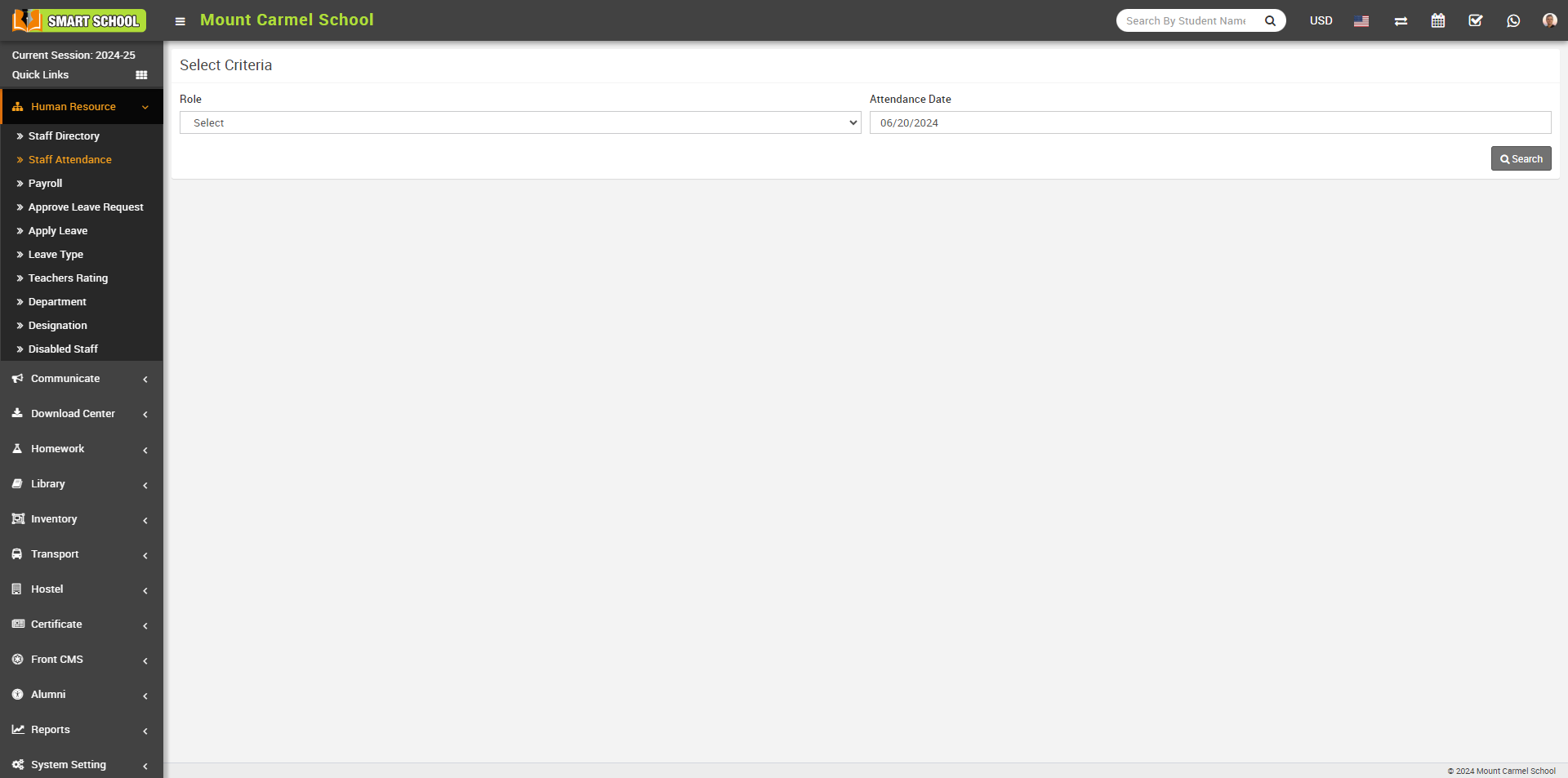 Here select Role and Attendance Date and then click on Search button. The list of staff will be shown in below of the page.