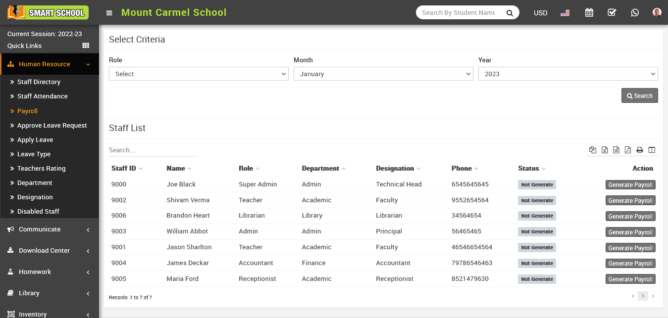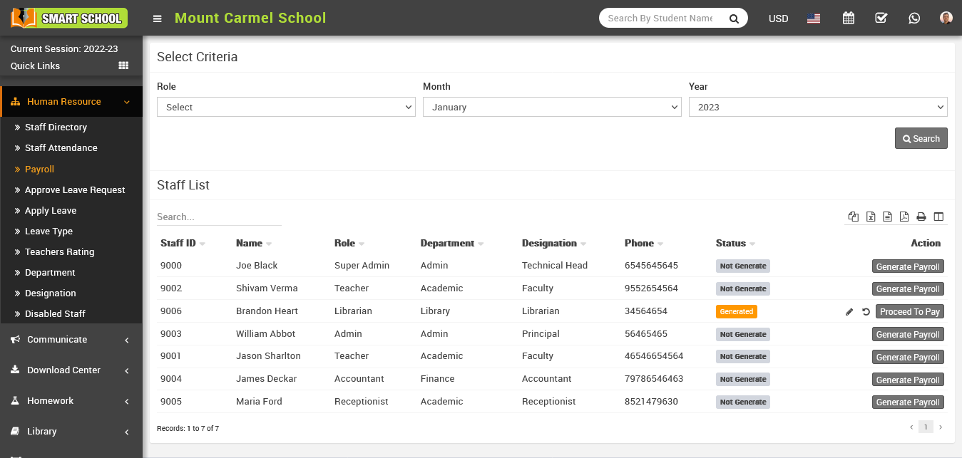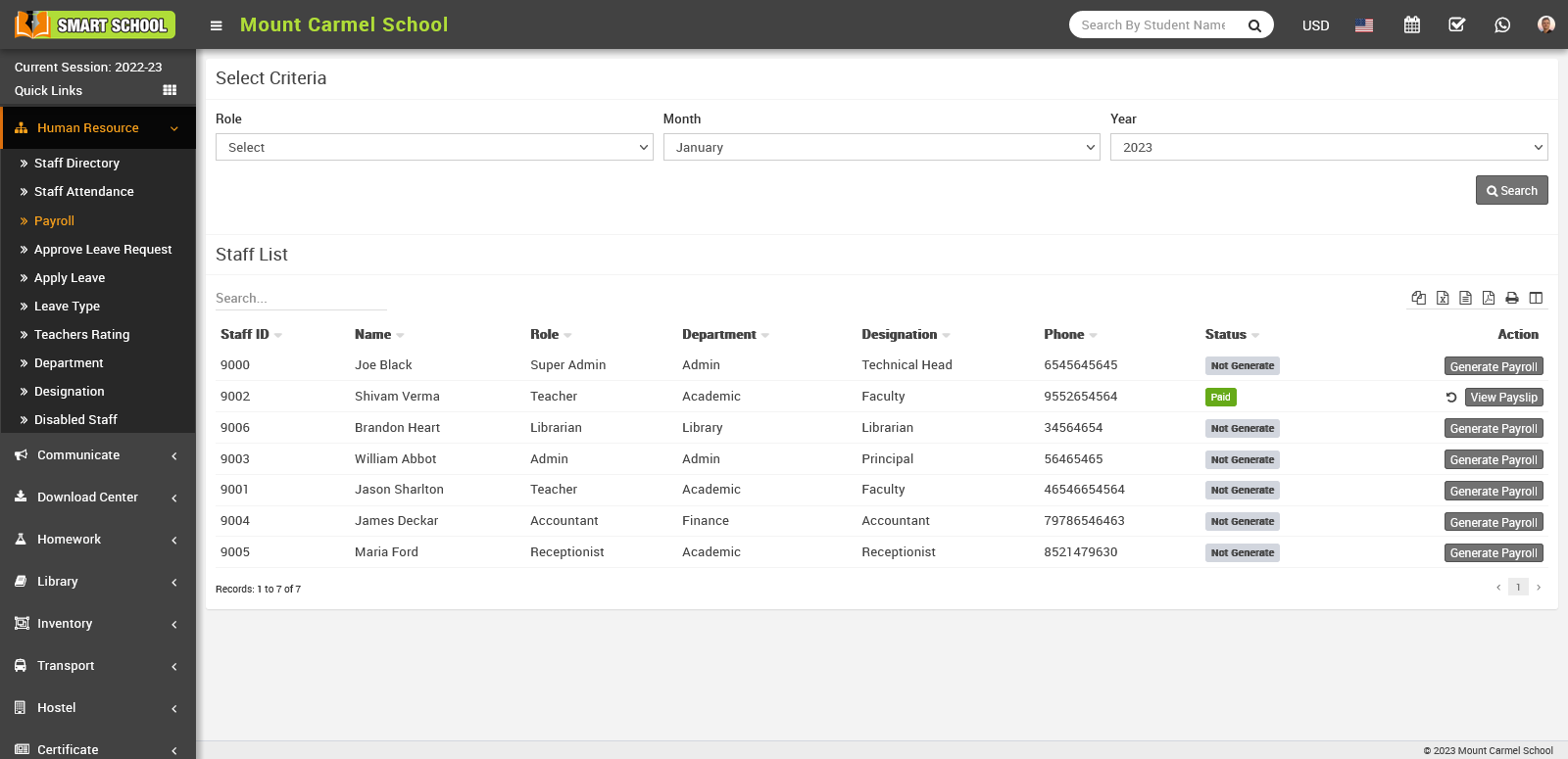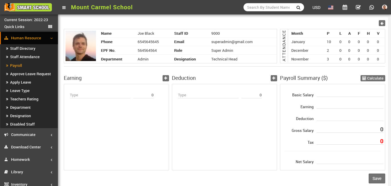 Now, in the Action column of the staff list, click on the Generate Payroll button, this will open the Staff Details page with the payroll form. You can see a staff member's profile and their attendance.