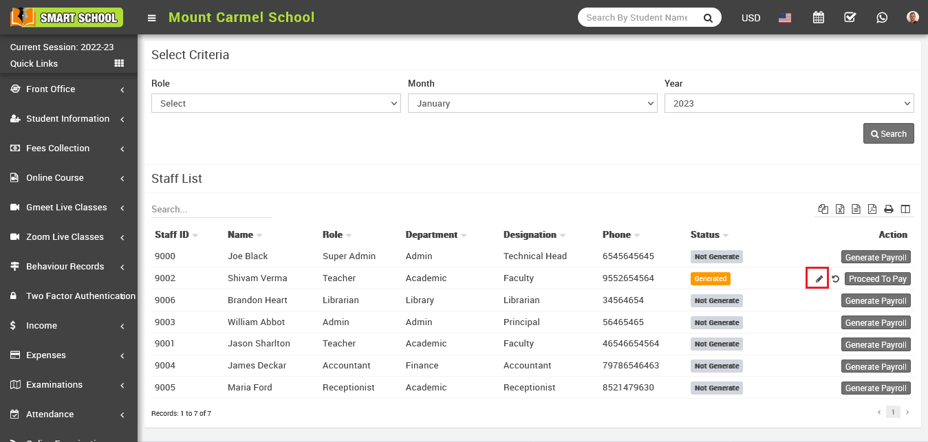 To Edit a generated salary, go to Human Resource > Payroll and select the role, month, and year criteria, then click on the search button. This will open the staff list, where you can see the payroll status in the status column. You can only edit the payrolls with a status of 'generated', which will have the edit option displayed next to them in the action column.