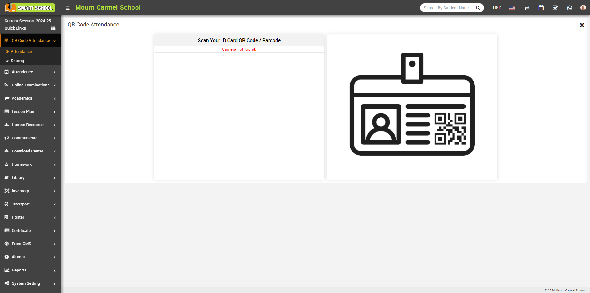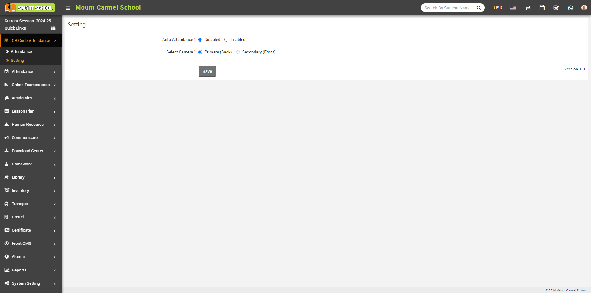In this page you can see the setting Auto Attendance and Select Camera, When you keep the auto attendance Enabled so when you scan your QR Code/Barcode it will mark the attendance automatically and if you want to keep the disabled, you have to mark the attendance manually. For more information please visit the youtube link https://www.youtube.com/watch?v=xRB1Fpv0Z3o or go to the QR Code Attendance article https://smart-school.in/category/qr-code-attendance here you will get all the information