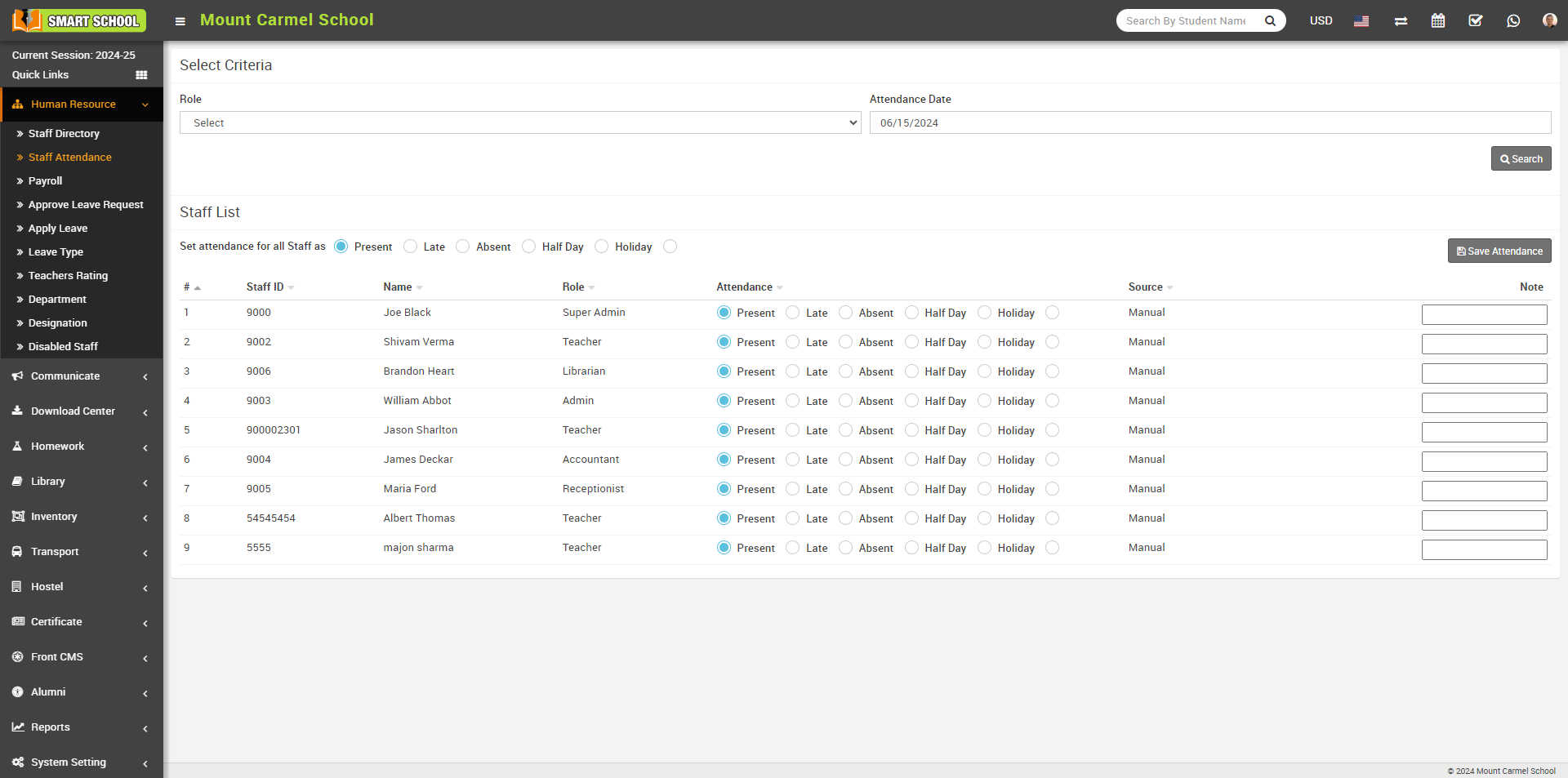 First, we proceed with Manual Type Staff Attendance. Simply select the attendance of the staff of the current date, here you can see Set attendance for all staff as option is available, using this option you can mark the all staff attendance at single click, if you want to mark the attendance as Present for the all staff, simply click on Present checkbox then click on Save Attendance button showing at the right side, all staff attendance will be mark as present at the same time and in Source column will show the type of Attendance as here we marked Manual Attendance. this process would be same for Late, Absent, Half Day, Holiday