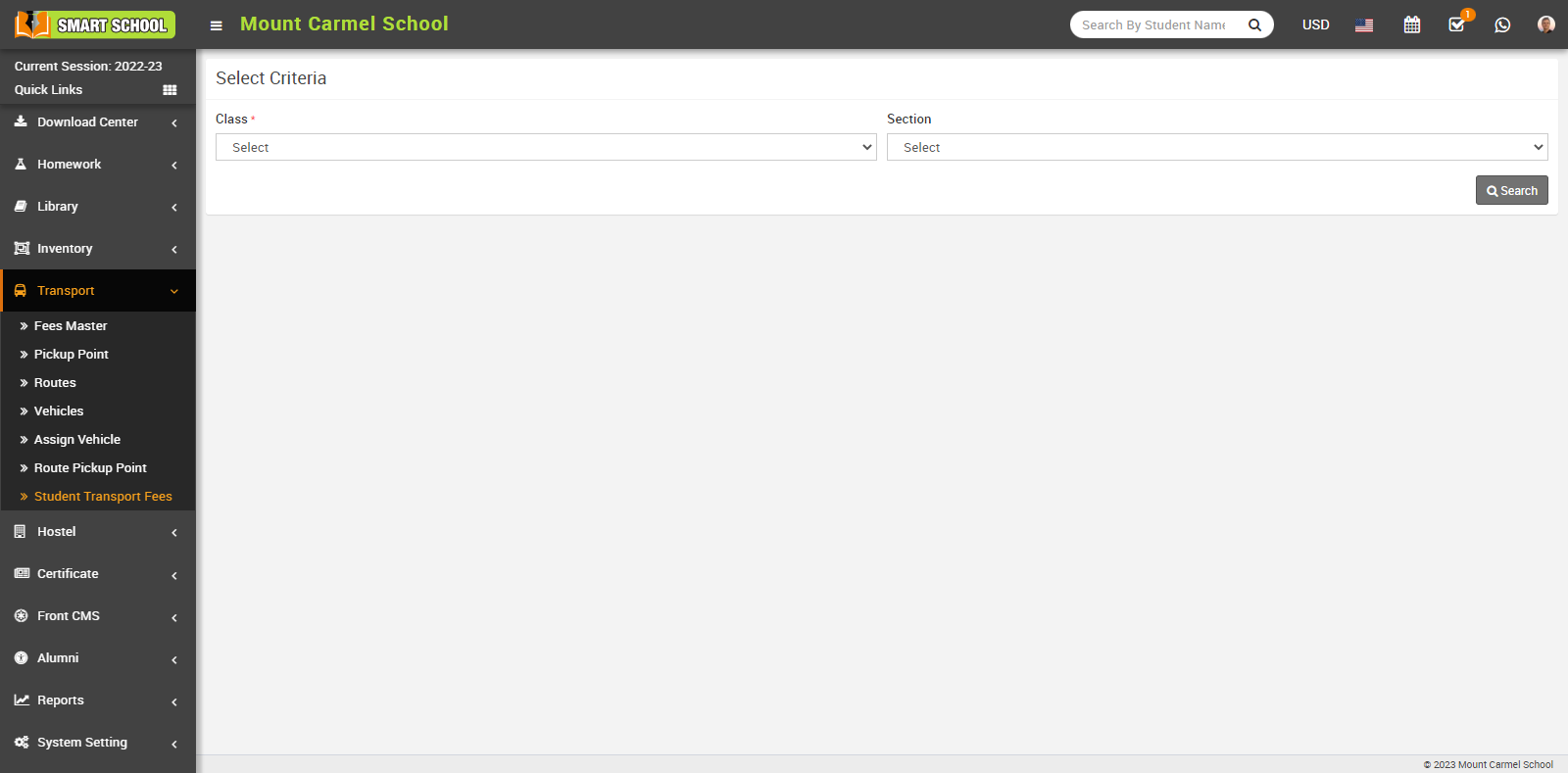 To add Student Transport Fees go to Transport > Student Transport Fees, select Class and Section then click on Search button.