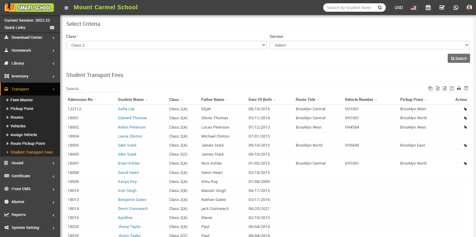 Here you can view Student Transport Fees, Admission No, Student Name, Class, Father Name, Date of Birth, Route Title, Vehicle Number, Pickup Point and Action column.